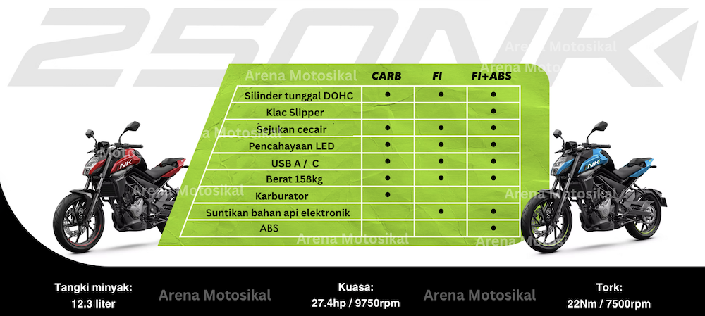 • 250NK EFI ABS – jenis suntikan bahan api dan ada sistem brek ABS
