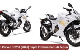 Suzuki mengumumkan dua warna baharu untuk motosikal jenis sport fairing penuh Suzuki Gixxer SF250 edisi 2026 di Jepun. Dua warna terbaharu itu ialah Pearl Glacier White x Matte Platinum Silver Metallic No. 2 (putih) dan Glass Sparkle Black (hitam). Ada satu warna sedia ada dikekalkan iaitu While Triton Blue Metallic/Pearl Glacier White (biru putih). Dalam […]